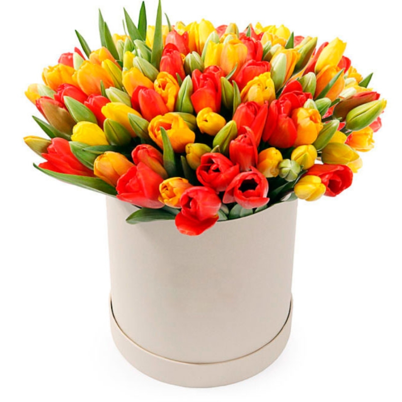 Букет состоит из 51 красный тюльпан, 50 желтых тюльпанов, коробка, оазис.