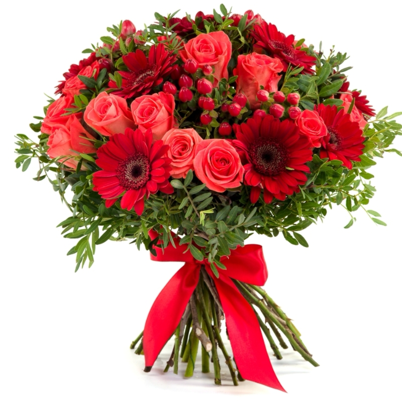 Букет состоит из 15 коралловых роз, 12 красных гербер, 5 гиперикум, зелень, прозрачная упаковка, атласная лента.