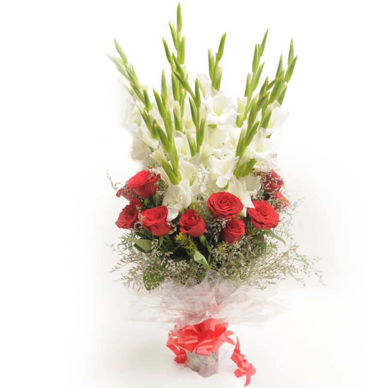 Букет состоит из 10 белых гладиолусов, 15 красных роз, 5 лимониум, красивая упаковка, атласная лента.