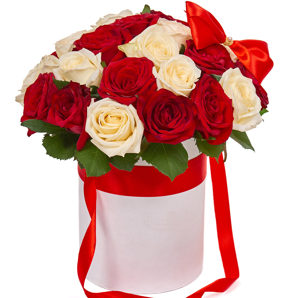 Красные и белые розы в коробке